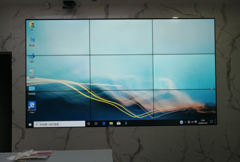 這套大屏采用3x3拼縫、46寸1.7mm液晶拼接屏,采用前維護(hù)內(nèi)嵌式安裝,大屏幕與墻面連成一體,更顯美觀、大氣,主要用來會(huì)議信息顯示。