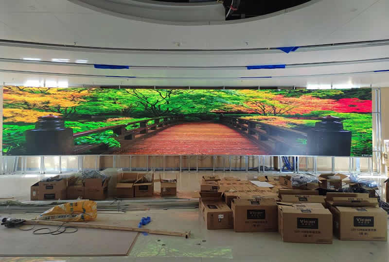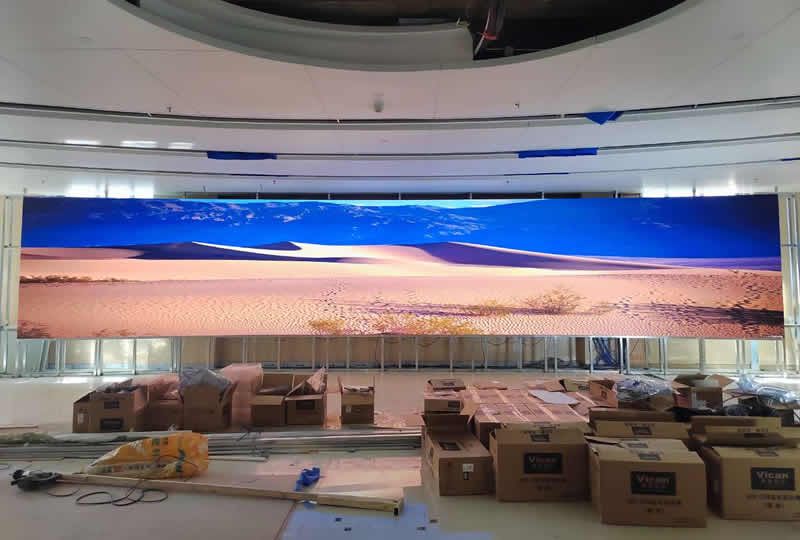 本案例中,維康國(guó)際為淮南市某企業(yè)展廳提供一套高清顯示屏幕,采用P1.25的COB小間距LED顯示屏,屏幕尺寸約30多平方米,畫(huà)面顯示十分清晰,色彩豐富,視覺(jué)體驗(yàn)效果好。