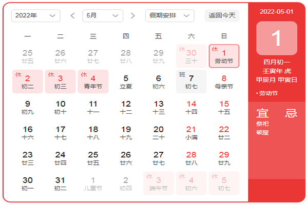 1、放假時間:2022年4月30日 - 2022年5月4日,共5天,2022年5月5日正常上班;