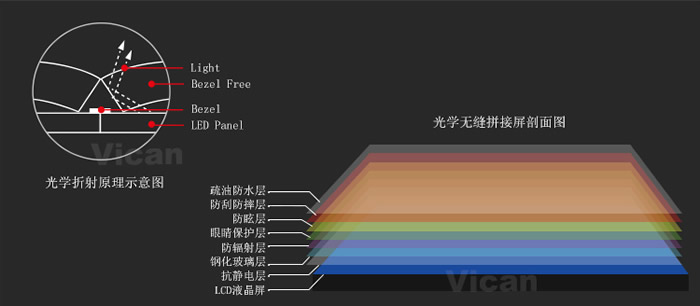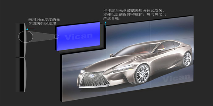 1、這款46寸無縫拼接大屏采用BFT技術(shù),和優(yōu)良高分子高透明材料PMMA,利用光線折射原理,解決液晶屏拼接存在的物理黑邊問題。