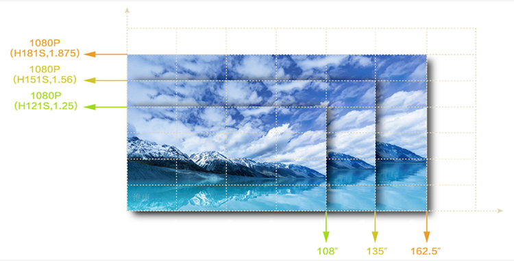 由于箱體是16:9比例,所以在拼接時(shí)只要保證等比例數(shù)量的拼接,整個(gè)LED顯示屏就不會(huì)發(fā)生變形,從而保證整體的顯示效果。如下圖,P1.2小間距l(xiāng)ed顯示屏通過(guò)4*4共16個(gè)箱體拼接即可實(shí)現(xiàn)1080P分辨率顯示;P1.5的則可以通過(guò)5*5拼接,P1.8的則通過(guò)6*6拼接。