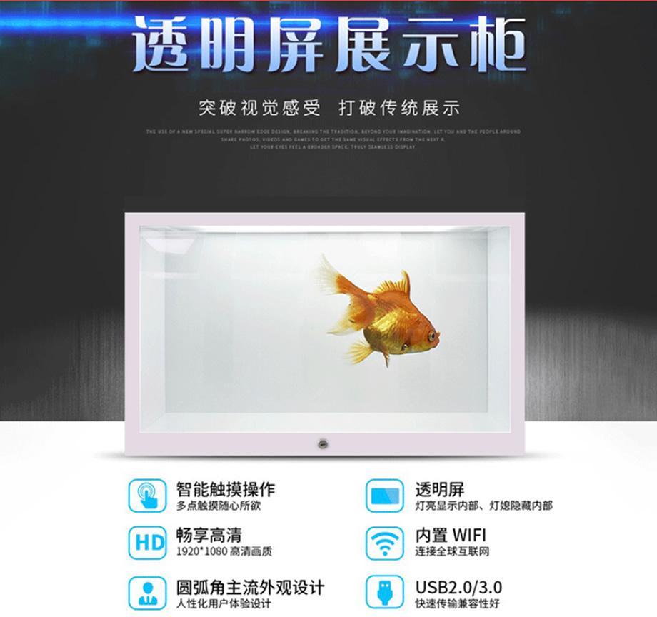 新一代液晶透明展示柜,在透明的的柜子上顯示廣告畫面,播放視頻,多角度的展示物品,柜子內(nèi)可放置物品,透明顯示屏可以進(jìn)行實(shí)物展示,信息的發(fā)布,簡(jiǎn)約時(shí)尚其獨(dú)特的透明技術(shù)引領(lǐng)當(dāng)今時(shí)代的廣告新潮流。
