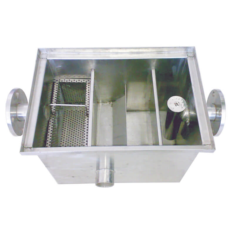 隔油池主要由兩槽'三槽'四槽分別組成,當(dāng)廚房排水流到第一槽時,雜物框?qū)⑵渲械墓腆w雜物(菜葉等)截流除去,進(jìn)入第二槽后,利用油水密度差使油水分離。廢水沿第二槽隔油板向下流動,進(jìn)入第三槽后從物理裝置凈化流出,再經(jīng)出水管收集排出。第二槽中的油珠顆粒物沿隔油板集聚向上漂浮流動,始終浮在隔油池的第二槽內(nèi),經(jīng)過隔油處理的廢水則溢流入排水渠排出池外,進(jìn)行后續(xù)處理,以去除乳化油及其他污染物。